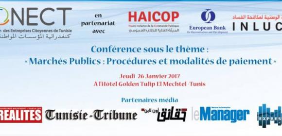 Participation de l’Agence nationale de certification électronique (TUNTRUST) à une conférence sous le thème :« Marchés Publics: Procédures et les Modalités de paiement » organisée par La CONECT en partenariat avec la Haute Instance de la Commande Publique "HAICOP", l'Instance de Lutte Contre la Corruption "INLUCC" et la Banque européenne pour la reconstruction et le développement "BERD" , le 26 Janvier 2017 à l’hôtel Golden Tulip El Mechtel - Tunis.